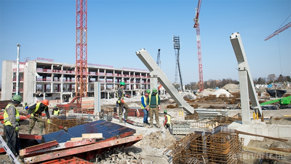 Felgyorsultak a stadionépítési munkák, és mostanra már látványos a változás a munkaterületen, egyre több elem áll a lelátókaréj szerkezetéből, a főépületben pedig a napokban elkezdik a kőműves munkákat.