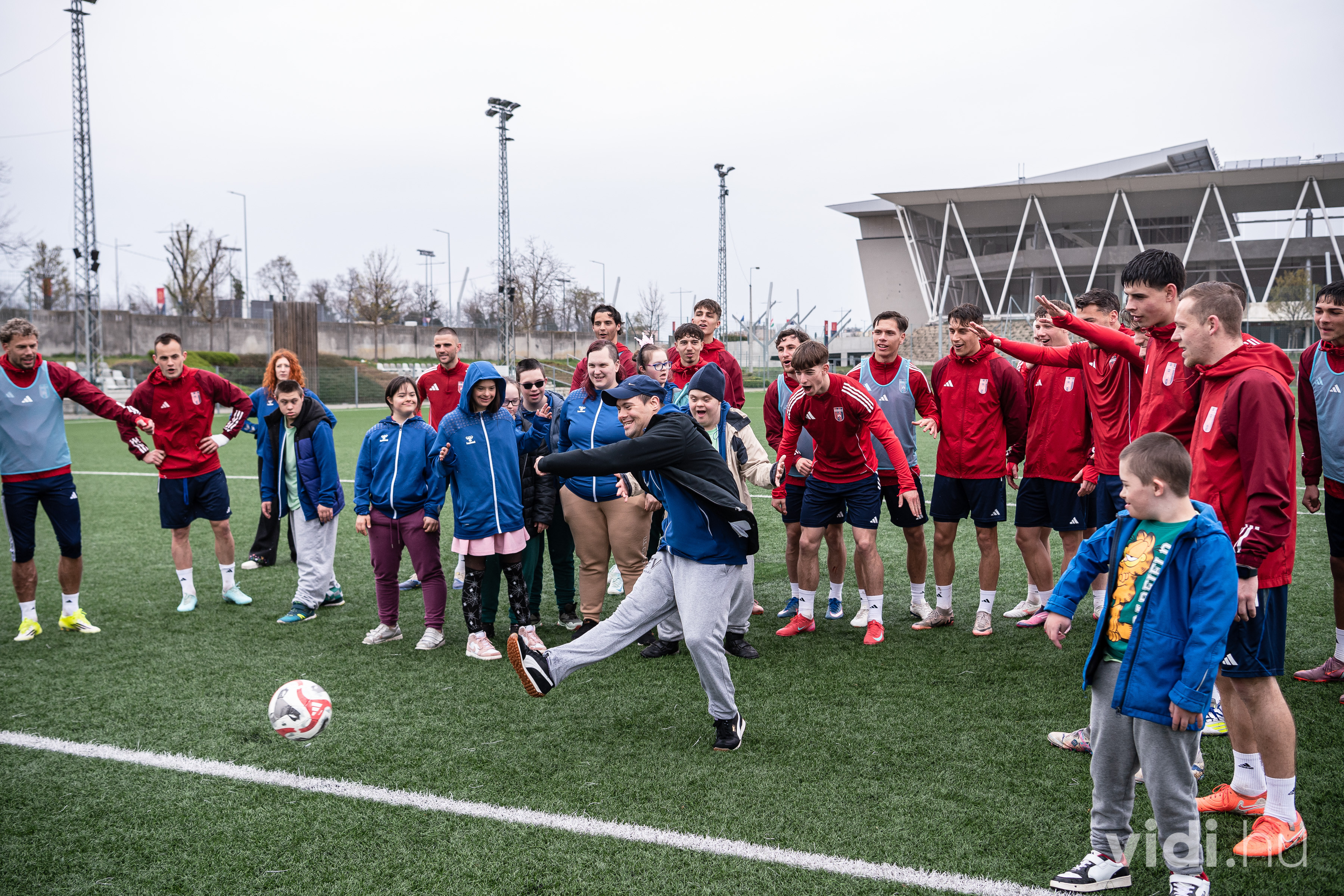 Csütörtökön tíz Down-szindrómás fiatal és kísérőik érkeztek csapatunkhoz. A stadiontúra után nem maradt el a közös focizás sem játékosainkkal.